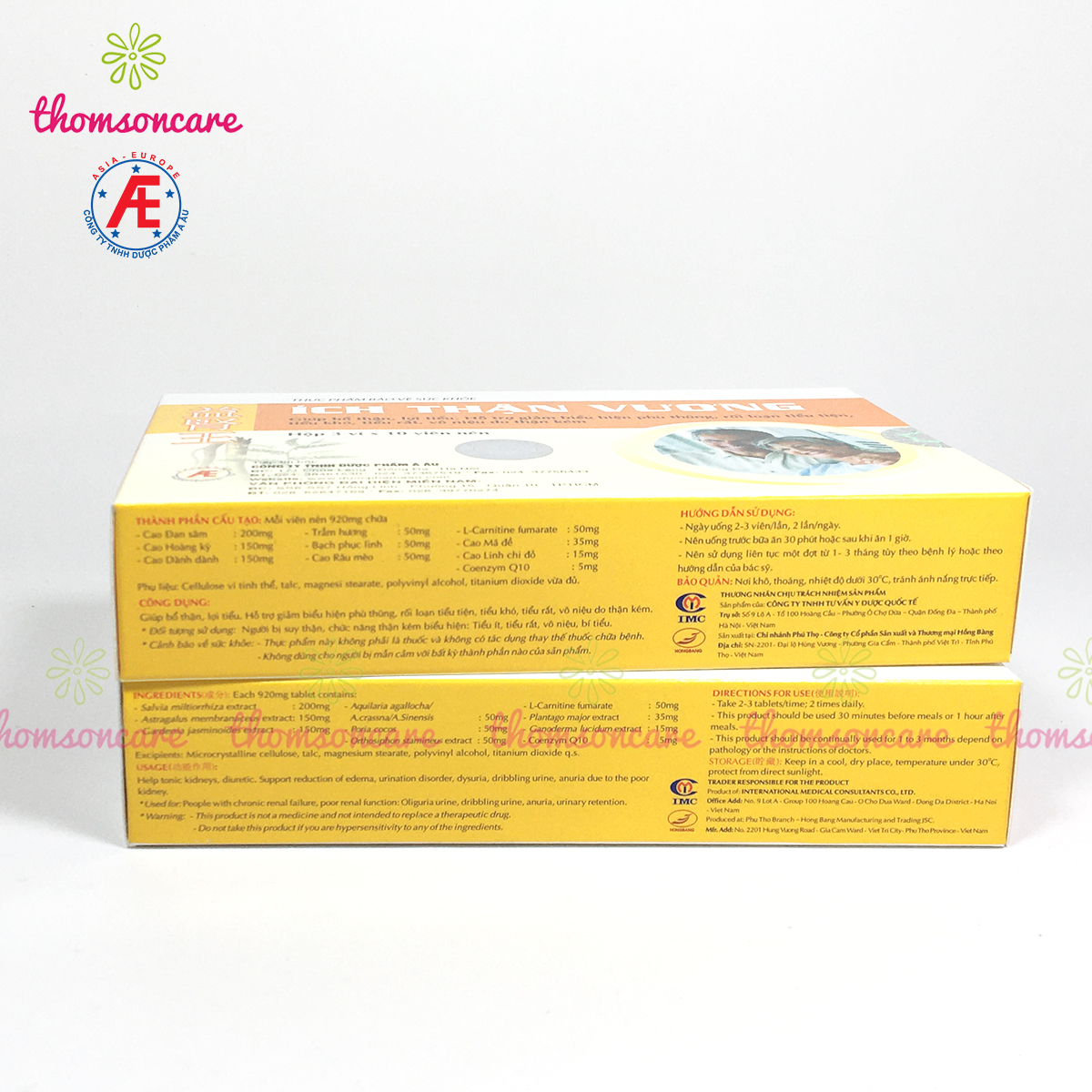 Mua 6 hộp Ích Thận Vương 30v - Tích điểm thành công tặng 1 hộp. Với phương châm “Vì sự hài lòng của Quý khách” - Thomsoncare luôn đồng hành cùng bạn "Chăm sóc sức khỏe cho mọi nhà" ======================= Thành phần của Ích Thận Vương: - Cao Dành dành 150mg | - Cao Đan Sâm 200mg | - Cao Hoàng Kỳ 150mg | - Trầm Hương 50mg | - Bạch phục linh 50mg | - Cao Râu mèo 50mg | - Cao Mã đề 25mg | - Cao Linh chi đỏ 15mg | - L - Carnitine fumarate 50mg | - Co - Enzym Q10 5mg. ======================= Công dụng sản phẩm: - Giúp bổ thận, lợi tiểu. - Hỗ trợ giảm biểu hiện phù thũng, rối loạn tiểu tiện, tiểu khó, tiểu rắt, vô niệu do thận kém. ======================= Hướng dẫn sử dụng: - Hỗ trợ phòng bệnh: ngày uống 2 lần, mỗi lần 1 viên. - Hỗ trợ đt ngày uống 2 lần, mỗi lần 2 - 3 viên. - Nên uống trước bữa ăn 30 phút hoặc sau khi ăn 1 giờ. - Nên dùng thành từng đợt liên tục từ 3 - 6 tháng để có kết quả tốt nhất. ======================= Đóng gói: - Hộp 3 vỉ x 10 viên - Lọ 90v =======================Cam kết:- Hệ thống Phòng khám – Nhà th..uốc Thomsoncare – Thâm niên trên 12 năm tại Hà Nội- Luôn tư vấn tận tâm, nhiệt tình với tâm của người Bác Sỹ- Đảm bảo tất cả sản phẩm luôn chính hãng 100%, nguồn gốc xuất xứ rõ ràng, nói không với hàng giả, hàng nhái, hàng kém chất lượng- Sản phẩm luôn có hạn sử dụng dài- Khi sản phẩm lỗi, hoặc hư hỏng khi vận chuyển mong bạn liên hệ lại với Shop ngay để shop xử lý nha ^^- Giá sản phẩm trên Tiki đã bao gồm thuế theo luật hiện hành. Tuy nhiên tuỳ vào từng loại sản phẩm hoặc phương thức, địa chỉ giao hàng mà có thể phát sinh thêm chi phí khác như phí vận chuyển, phụ phí hàng cồng kềnh, .....Giá sản phẩm trên Tiki đã bao gồm thuế theo luật hiện hành. Bên cạnh đó, tuỳ vào loại sản phẩm, hình thức và địa chỉ giao hàng mà có thể phát sinh thêm chi phí khác như phí vận chuyển, phụ phí hàng cồng kềnh, thuế nhập khẩu (đối với đơn hàng giao từ nước ngoài có giá trị trên 1 triệu đồng).....