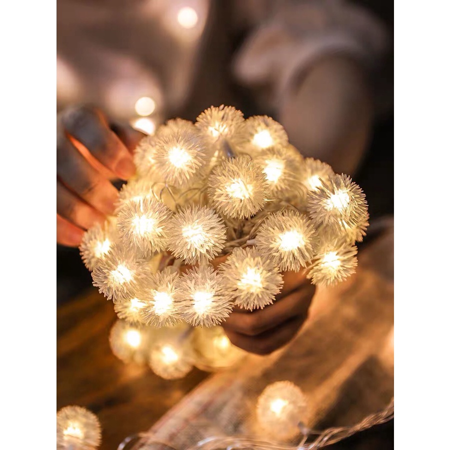 Đèn led trang trí phòng ngủ hình tròn quả lông, Dây led ánh sáng vàng dùng pin dài 3m