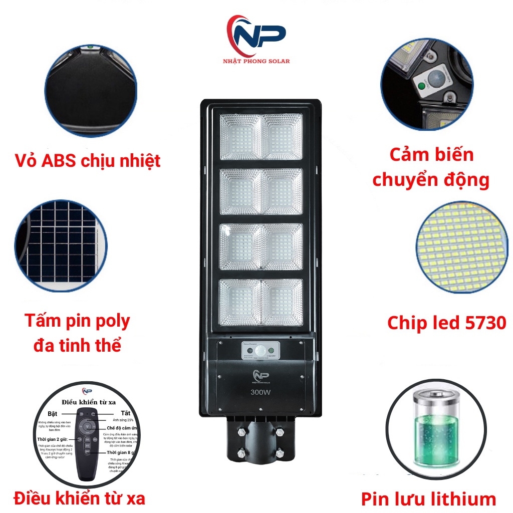 Đèn năng lượng mặt trời liền thể đơn 200W,300W Nhật Phong solar có cảm biến chuyển động,điều khiển từ xa,BH 2 năm