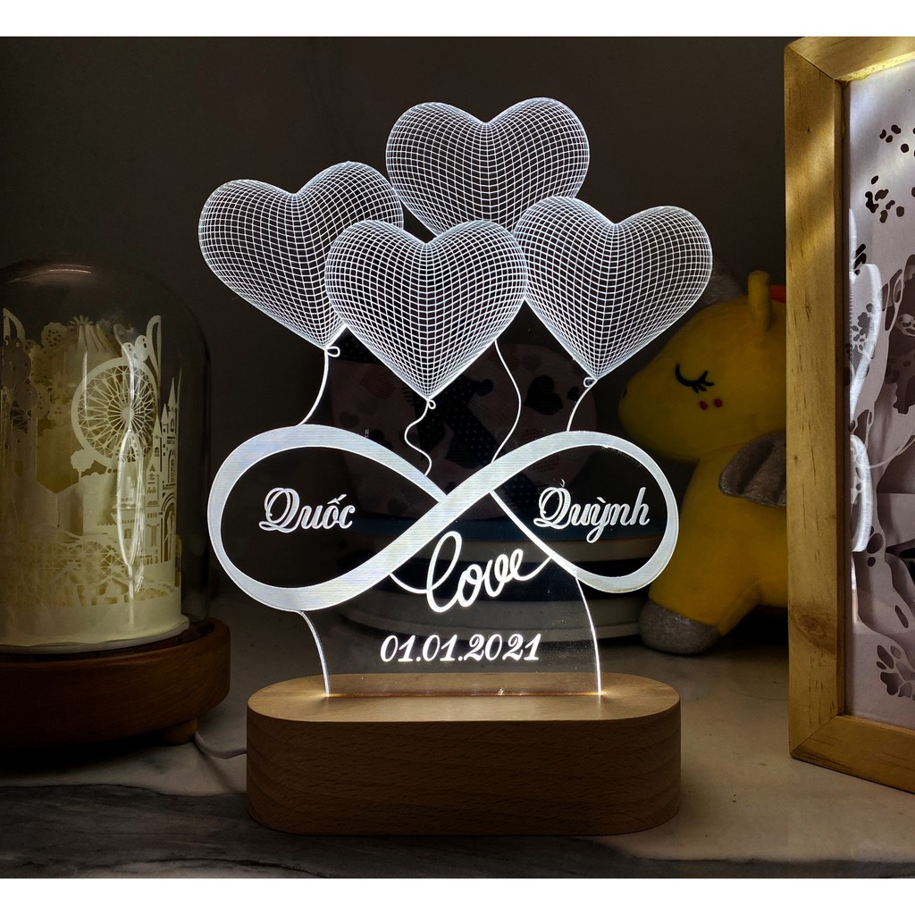 Đèn Ngủ Led 3D, Quà tặng đám cưới | KHẮC CHỮ THEO YÊU CẦU - ĐẾ GỖ - Bảo Hành 6 Tháng