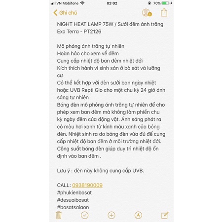 Thông tin về đèn sưởi đêm Moonlight Exo Terra. Một loại đèn mang lại ánh sáng ánh trăng, nhẹ mắt với Pet và AE sử dụng. Sáng + Ấm mềm mại giúp Pet dễ chịu và tiêu hoá tốt ngay cả trong giấc ngủ. Đèn sưởi Moonlight Exo Terra thích hợp sử dụng với các dòng bò sát cảnh hoạt động chủ yếu vào ban đêm như săn mồi, ăn uống… Bóng đèn sưởi đêm tạo ra ánh sáng giống như ánh trăng chiếu sang vào các hôm rằm mà không gây ảnh hưởng đến chu kỳ ngày và đêm của bò sát. Đèn sưởi đêm tạo ra nguồn nhiệt bằng tia hồng ngoại sưởi ấm môi trường bên trong chuồng. Đèn sưởi đêm Moonlight Exo Terra thích hợp sử dụng cho cả loài bò sát sa mạc đến cả các loài bò sát sống trong môi trường nhiệt đới. WED : BOSATSAIGON.COM FACE: Trịnh Đức Tân (Alan Duc Tan) ZALO: 0938190009