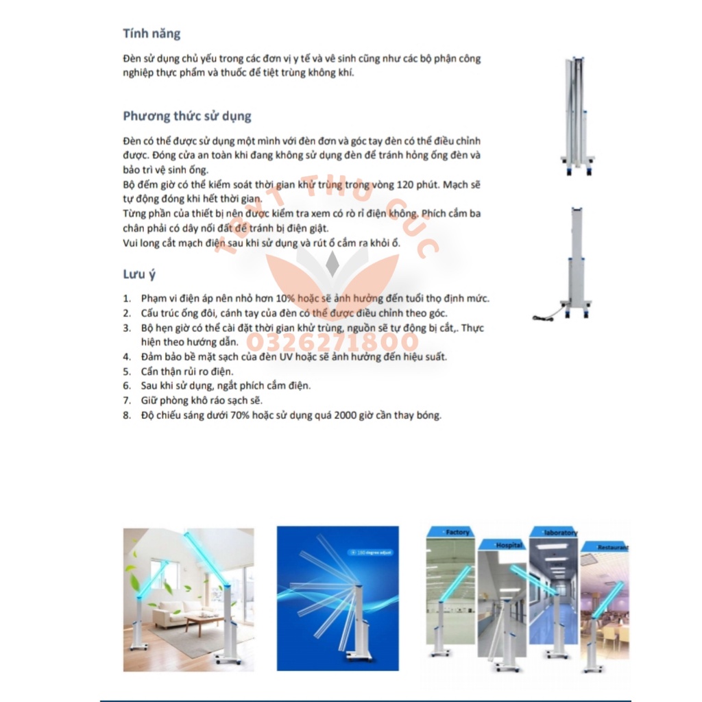 Đèn tiệt trùng di dộng FY 30DC, đèn UV di động Đèn tiệt trùng di động bao gồm 2 đèn UV 30W Đèn tạo ánh sáng cực tím cường độ cao có thể chiếu mọi bề mặt trong phòng và diệt bất kỳ vi sinh vật nào hoặc mầm bệnh bao gồm MRSA, bênh tay chân miệng, cảm lạnh và cúm, viêm phổi, nấm mốc, e.coli, salmonella và các loại vi khuẩn tương tự… - Ánh sáng xuyên qua và phá hủy DNA thực của vi sinh vật. - Không có vi sinh vật nào được biết đến có miễn nhiễm với năng lượng UV-C. - Đèn tiệt trùng UV khử trùng lên tới diện tích phòng khoảng 30m2. - Có nhiều tính năng an toàn cùng với bộ đếm giờ 0-120 phút. - Có nhiều ứng dụng của đèn tiệt khuẩn tia cực tím không chỉ dành cho bệnh viện mà có thể dùng trong trường học, khu vui chơi, khách sạn, phòng khám, tại gia, phòng chiếu phim, tòa nhà, công ty sản xuất thực phẩm và các văn phòng… - Khử trùng hiệu quả và nhanh chóng trên mọi bề mặt và không khí trong vòng vài phút. - Đèn tiệt trùng di động đã được thử nghiệm trong phòng thí nghiệm, được sử dụng tại các bệnh viện và được các bác sỹ khuyên dùng. Thông số kĩ thuật Đèn tiệt trùng cực tím di dộng FY-30DC: - Làm từ thép carbon, cấu trúc hai ống, có thể sử dụng độc lập - Công suất : ≥30W x 2 - Số bóng: 02 bóng - Diện tích tĩnh ứng dụng: ≥30m2 - Điện thế: 220V±10% - Tần số: 50Hz±10% - Công suất: 180VA - Bước sóng: 253.7nm - Bức xạ: ≥214uw/cm2 - Di chuyển và gập lại dễ dàng: Có - Bóng có thể gập vào và điếu chỉnh các góc khác nhau: 90°,135°,180° - Hẹn giờ: 0 -120 phút NKPP TBYT THU CÚC 0326271800 ------------------ #khukhuan#dentiettrungdidong#denUVdidong#satkhuan#phongdich