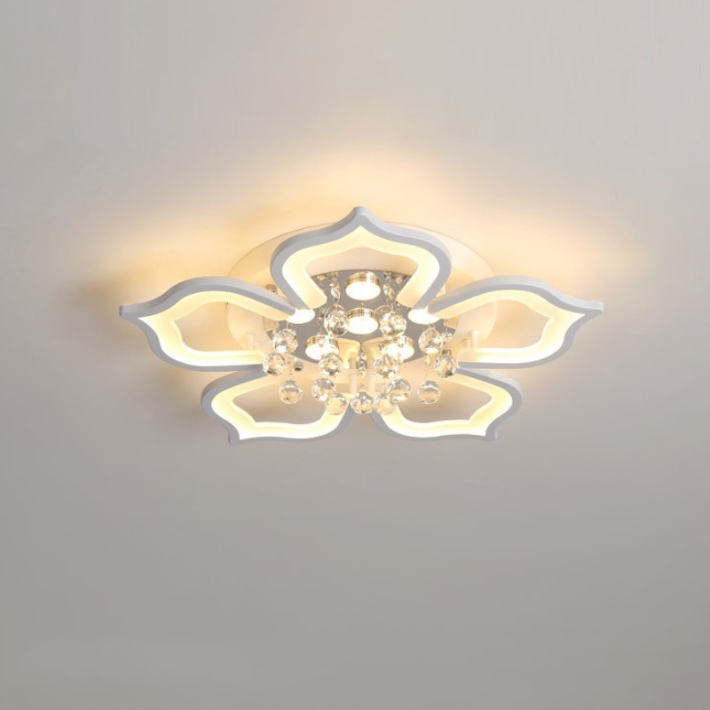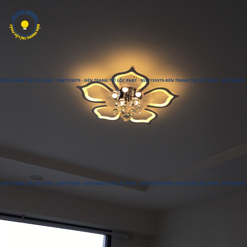 Đèn trần, đèn ốp trần 5 cánh sen thả pha lê 3 chế độ sáng kèm khiển trang trí phòng sang trọng, hiện đại