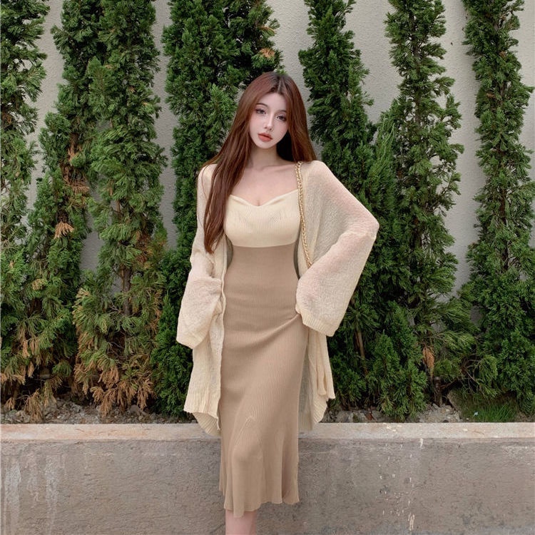Đầm ôm eo hai dây và Áo khoác phong cách Pháp thời trang mùa thu cho nữ