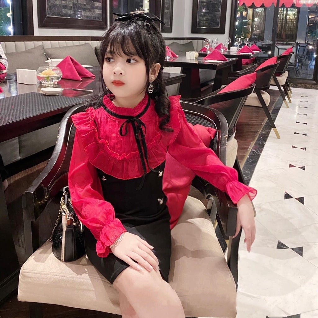 Đầm Bé Gái Diện Tết Chuột Lắc Store Thun Umi Phối Tay Voan 10kg Đến 22kg Màu Đỏ Kem