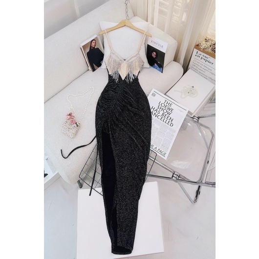 Đầm dạ hội kim sa hai dây phối tua rua đính hạt