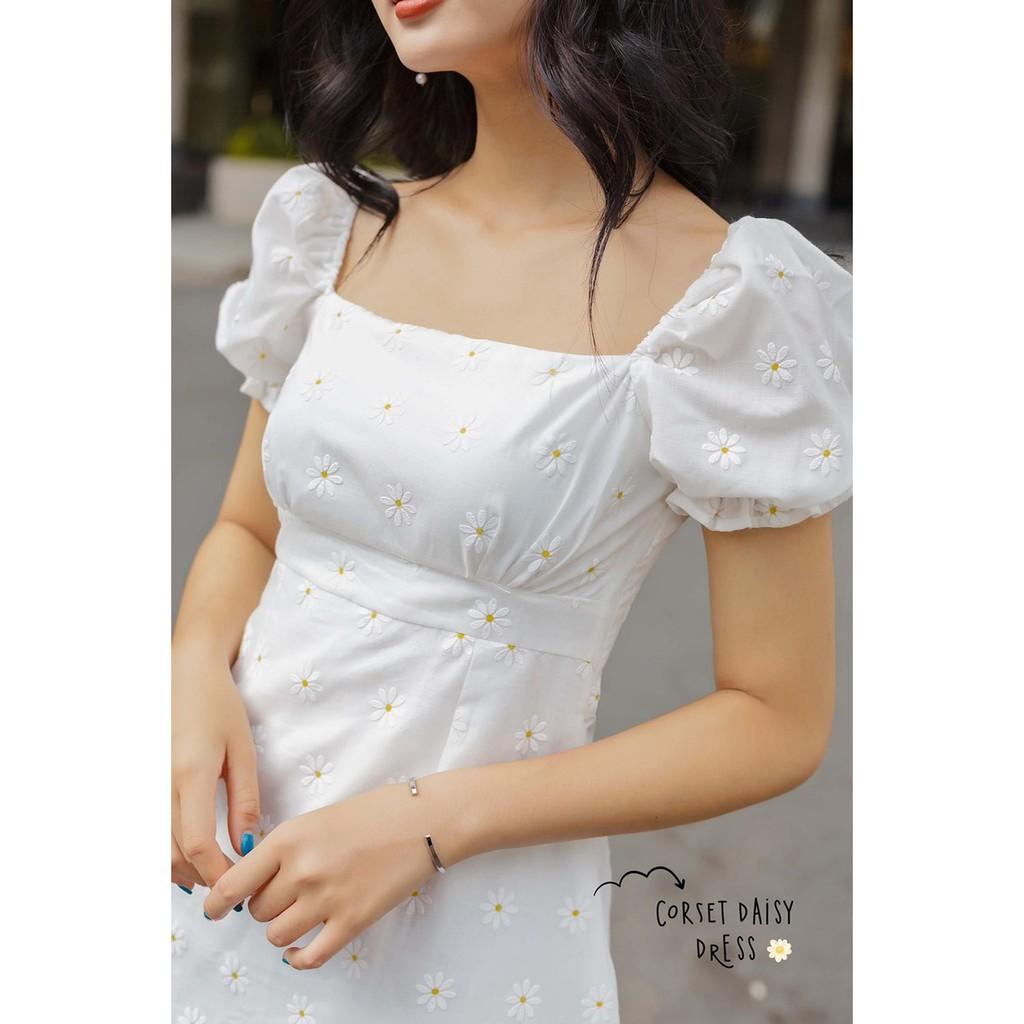 ĐẦM DỰ TIỆC LILEN HOA CÚC TRẮNG TAY NGẮN CỔ VUÔNG DÁNG XÒE NGẮN 2 LỚP