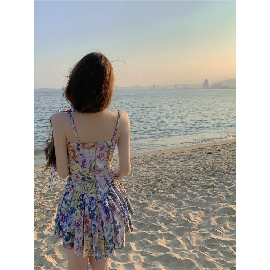 Đầm hai dây hoa hè tông tím xòe ly đi biển dạo phố Jennie
