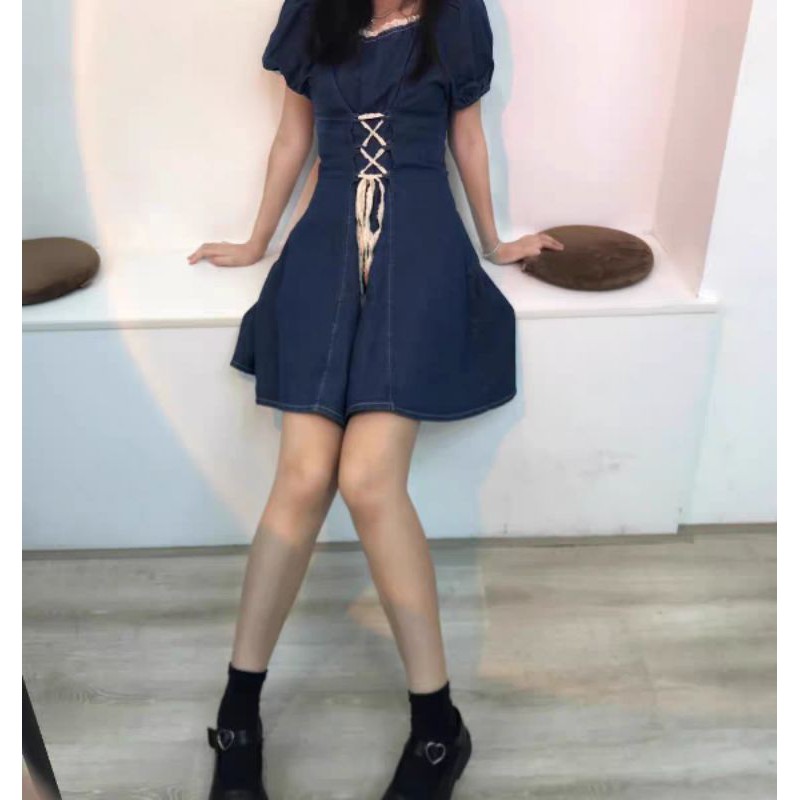 ĐẦM JEAN THẮT DÂY EO TAY BỒNG BỀNH🍒ẢNH THẬT 100%
