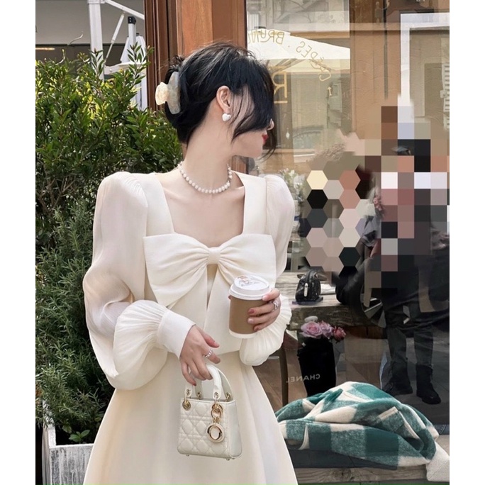 ĐẦM KEM NƠ NGỰC TAY DÀI BO