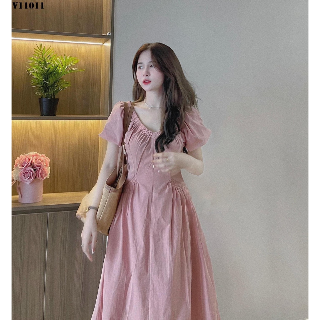 Đầm Kiểu Nữ Nhún Thun Cổ Màu Hồng Xinh Xắn TTST0157