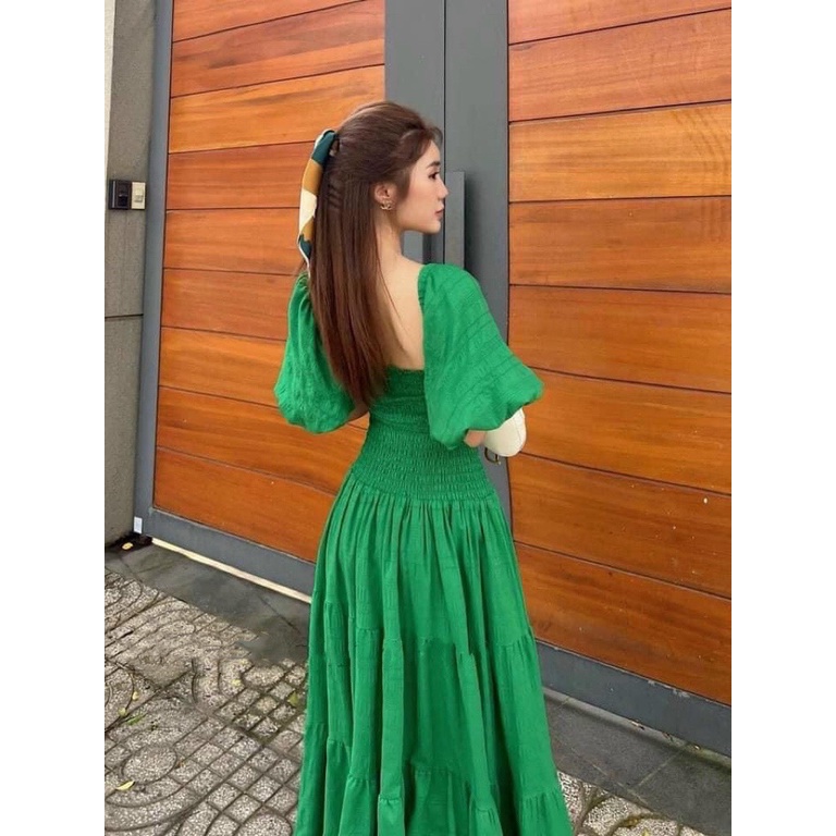 Đầm maxi đũi xanh dương xanh mint áo nhún xoè tay phồng - set áo croptop tay bồng chân váy dài đi chơi đi biển