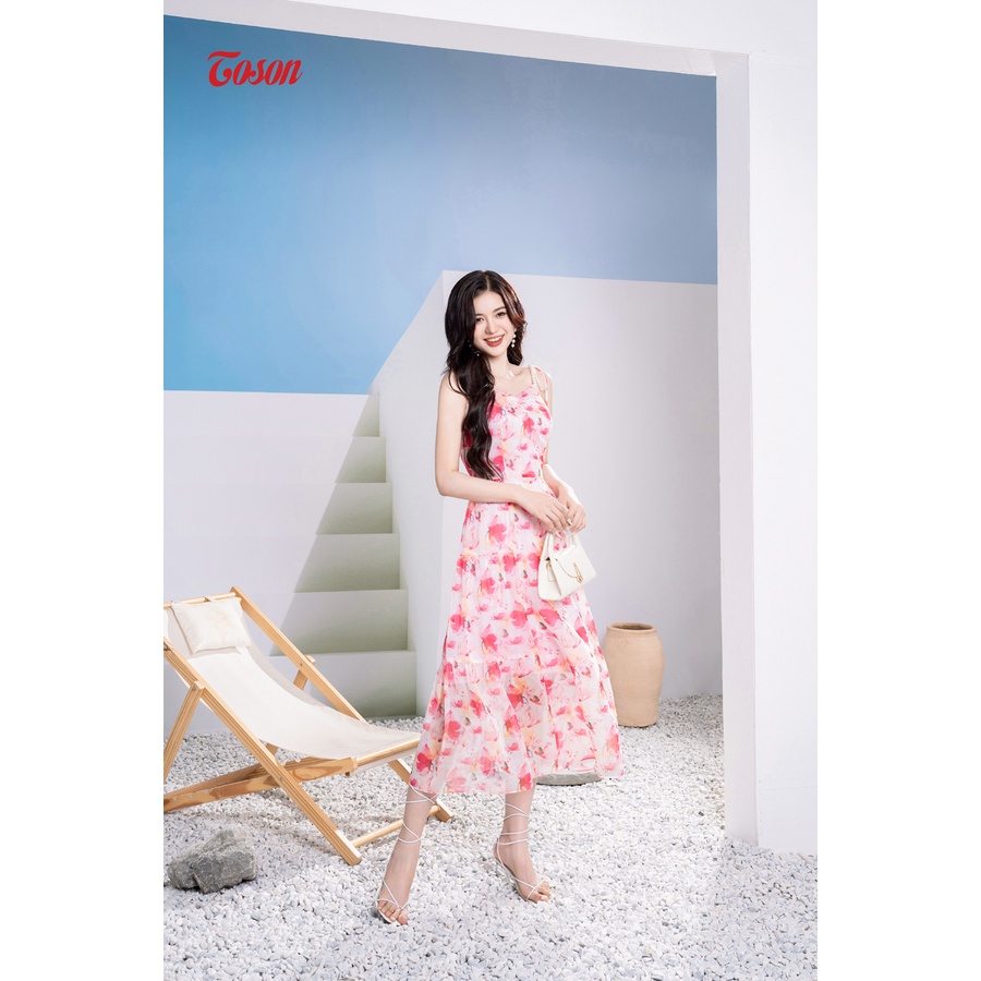 Đầm maxi họa tiết hoa đỏ nhún 3 tầng, dây vai ngọc trai Toson 48095H63