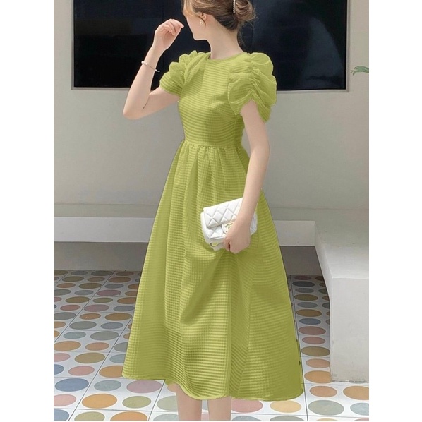 Đầm midi xoè tay nhún bồng xốp ô vuông