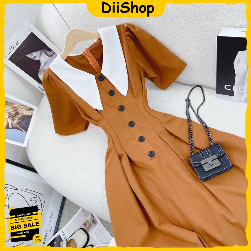 Đầm nữ cổ V đính nút, đầm vintage dáng suông dài, đầm tiểu thư tay ngắn, đàm retro phong cách Pháp