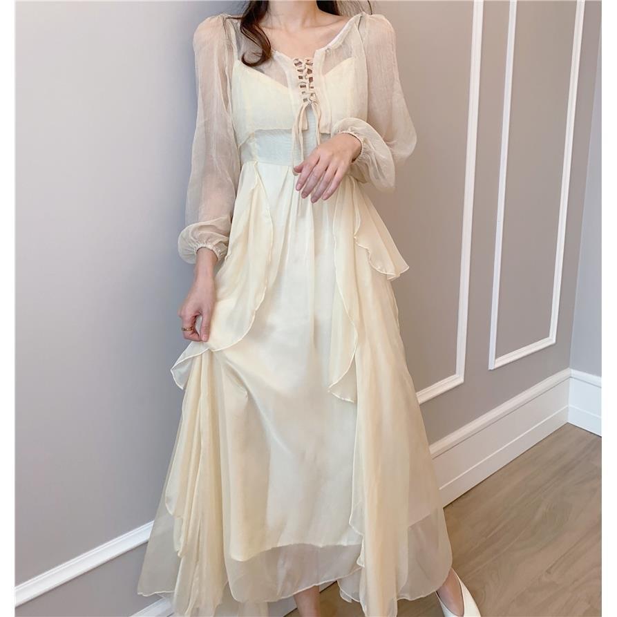 tiktok mẫu hot, hàng mới 2022, đảm bảo chất lượng, phúc lợi Nơi giao hàng: Tỉnh Quảng Đông Phong cách: ngọt ngào và tươi mát Các yếu tố / hàng thủ công phổ biến: dây đai Hình thức kết hợp: bộ đồ hai mảnh Phong cách: không đều Chiều dài tay áo: dài tay Váy dài: váy dà