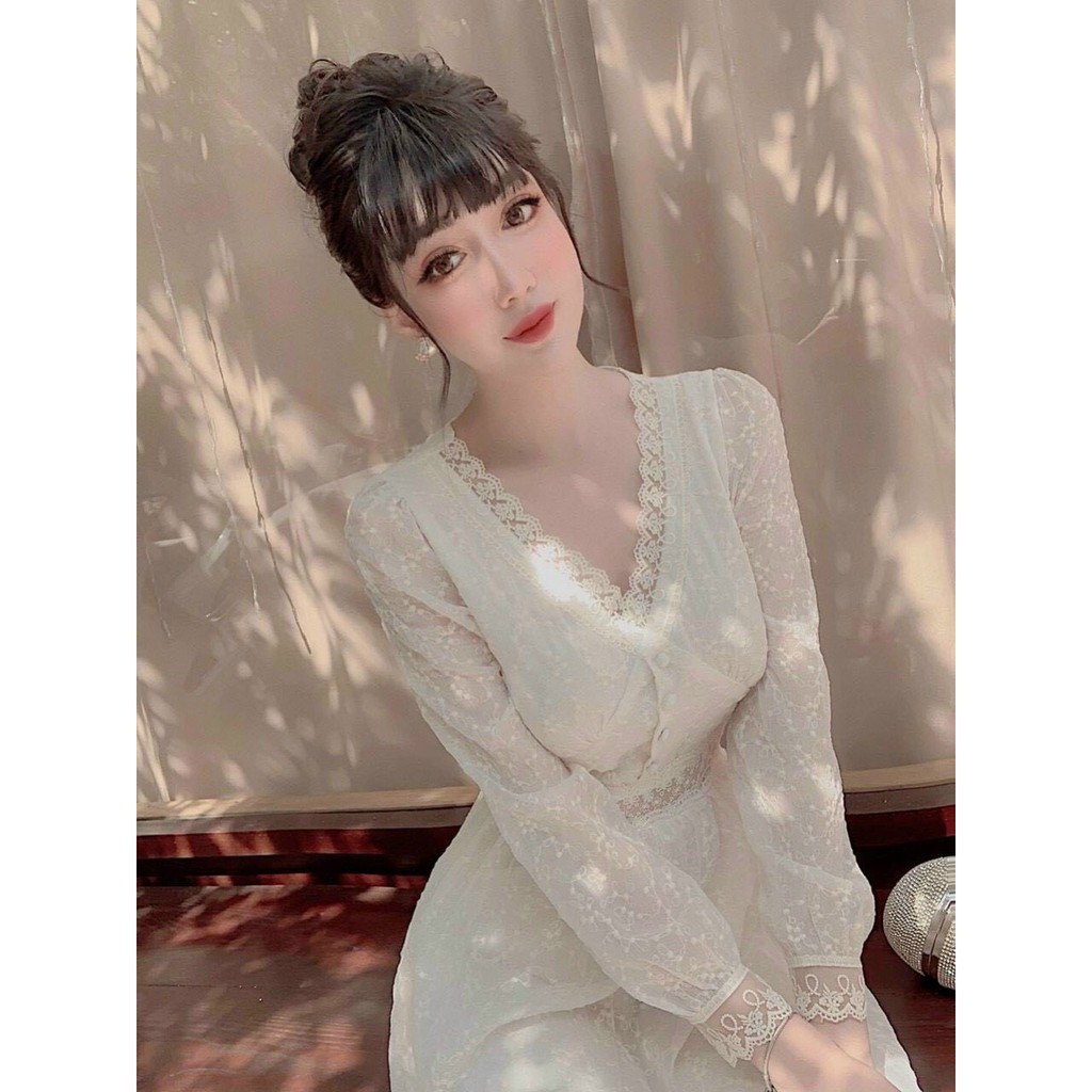 Đầm ren xòe tay dài cổ V tiểu thư sang chảnh, chất ren cao cấp hàng thiết kế, eo cao dáng dài mặc là xinh, giá rẻ