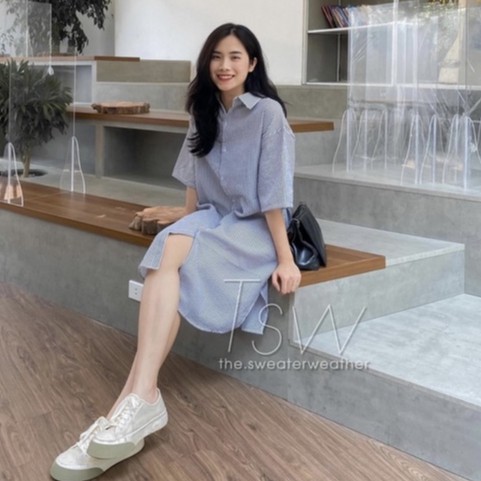 Đầm sơ mi ngắn tay kẻ sọc chất xốp siêu mát hài màu đen xanh. Váy polo kẻ sọc đuổi tôm xẻ tà siêu điệu