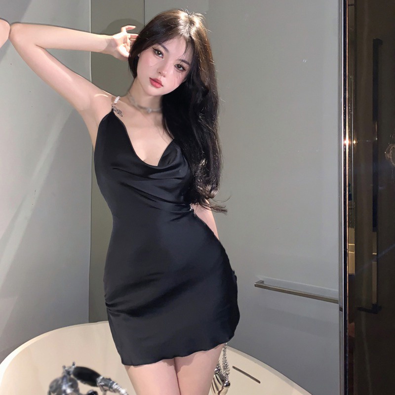 Đầm Satin Dài Tay Hở Lưng Đan Dây Chéo Đính Ngọc Trai Phong Cách Hàn Quốc Quyến Rũ Dành Cho Nữ