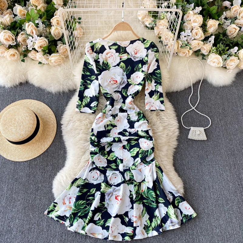 Đầm tay dài dáng ôm đuôi cá hoa lá mix màu xanh