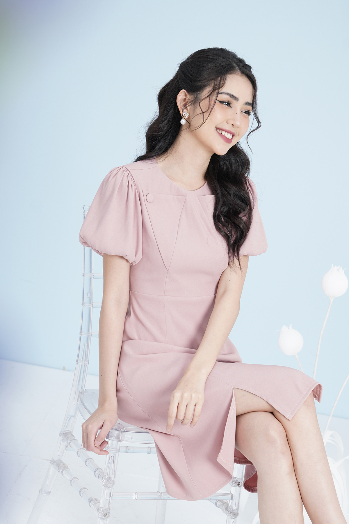 Đầm Thiết Kế Dáng Ôm A Luperi LFV3288 Tay Bồng Cổ Tròn Phối Túi Cúc