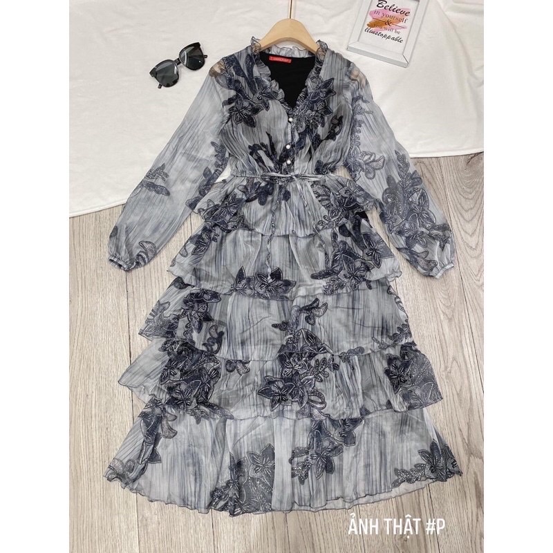 ĐẦM TIỂU THƯ VOAN TƠ HOA XÁM BO CHUN CỘT NƠ RÚT EO, CÚC NGỌC TAY DÀI CÓ 2 LỚP