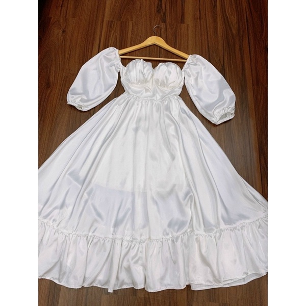 Đầm váy phi satin trắng dài xoè nhẹ cúp ngực hở/bẹt/trễ/rớt vai, thời trang tiểu thư sang trọng quý phái đi chơi dự tiệc