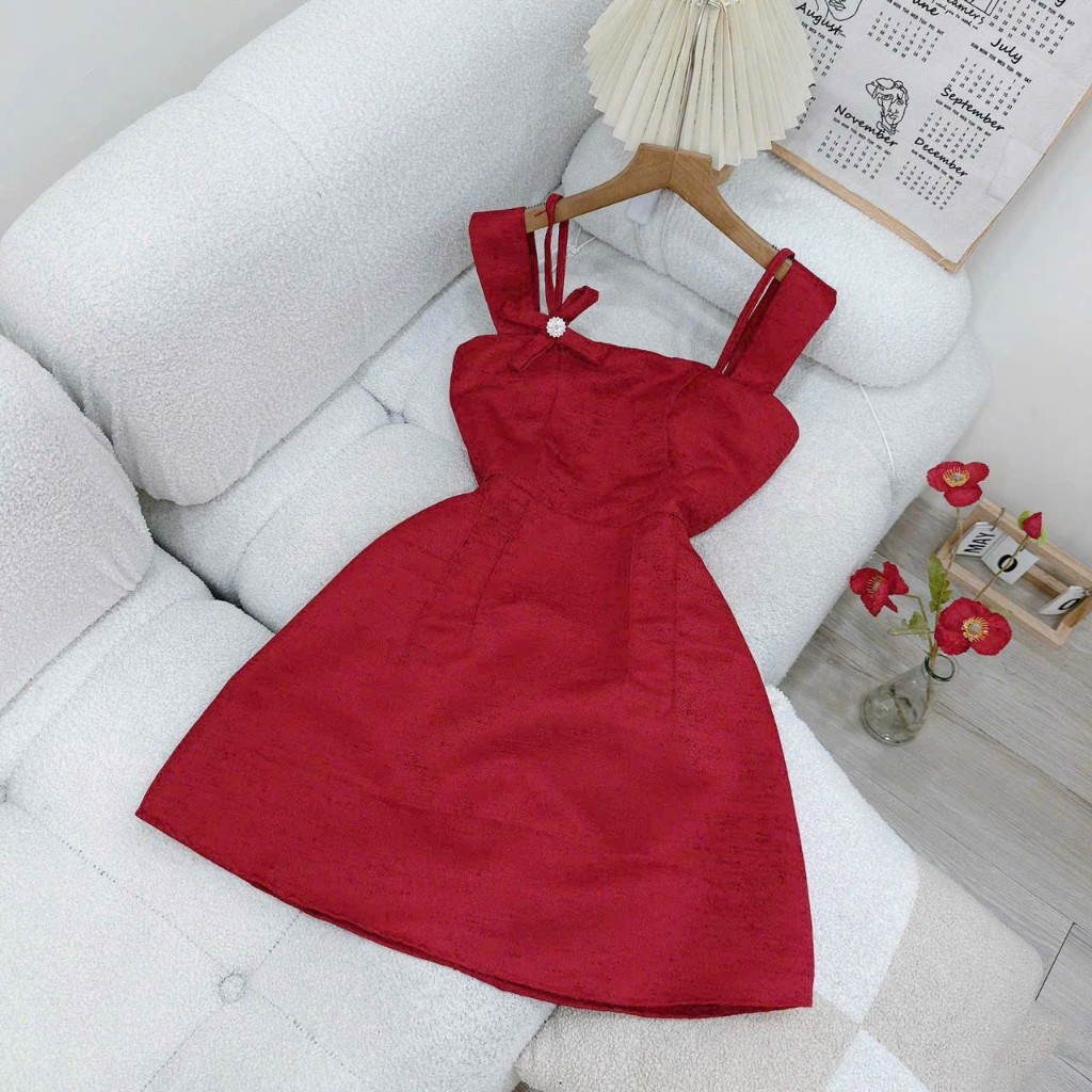 Đầm xòe 2 dây đính nơ siêu đẹp ở vai