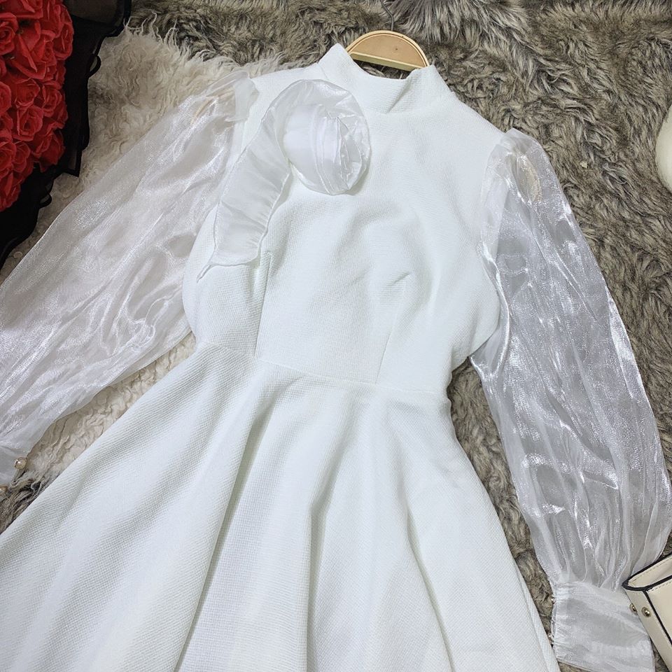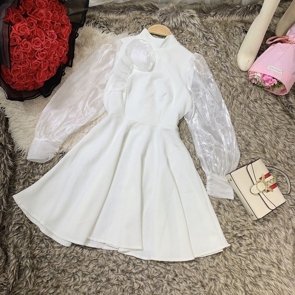 Đầm xòe gấm tay voan ngực đính hoa vải cao cấp - VN202101