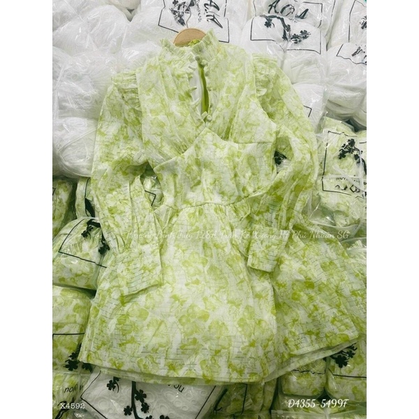 Đầm xoè dài tay cổ tàu hoa xanh hình sàn thật
