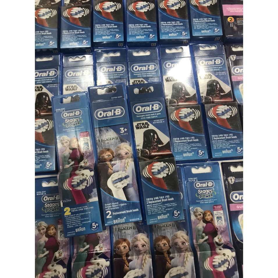 - Precision: Đầu chải thông dụng nhất của Oral-B, làm sạch nhẹ nhàng từng răng một. Đầu xoay nhỏ giúp dễ dàng tiếp cận các răng nằm sâu bên trong. - Sensitive - Làm sạch nhẹ nhàng: Với lông chải mềm, làm sạch nhẹ nhàng, an toàn cho những người có răng nướu nhạy cảm. - Floss Action - Làm sạch mảng bám tốt nhất: Thiết kế lông chải Micropulse bằng cao su, thâm nhập sâu giữa các kẽ răng, làm sạch thức ăn như sử dụng chỉ nha khoa. - CrossAction - Làm sạch vượt trội nhất: Thiết kế tiên tiến của lông bàn chải nghiêng 16 độ xoáy sâu vào các kẻ răng, dọc theo viền nướu. - 3D White - Làm trắng răng tự nhiên: Thiết kế lấy cảm hứng từ các dụng cụ nha khoa, có lõi cao su ở giữa để làm sạch bề mặt, đánh bóng răng hiệu quả. - Star Wars: Bé Trai - Elsa: Bé gái