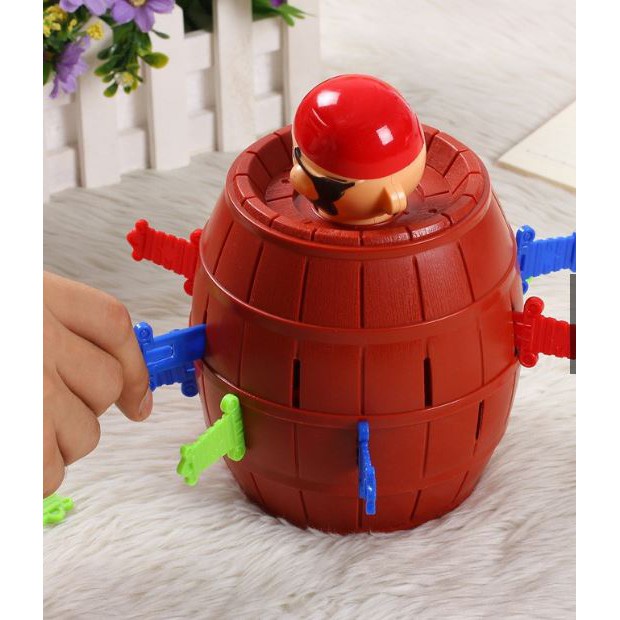 Đâm hải tặc (có 4 size) Cách chơi: Trái ngược với các trò chơi khác, trong trò chơi Đâm hải tặc, ai là người đâm trúng để Hải tặc "nhảy" lên thì là người thua cuộc. Vì vậy bạn sẽ luôn luôn hồi hộp và lo sợ khi hải tặc luôn có thể làm bạn bất ngờ bất kỳ lúc nào! Lần chơi sau, bạn rút hết kiếm trên thân thùng ra, đặt hải tặc vào và xoay vài vòng. "Lỗ bí mật" sẽ chuyển dịch ra một vị trí khác và mọi người có thể bắt đầu lại cuộc tìm kiếm của mình. Cụ thể: - Đặt đồ chơi hải tặc vào thùng, ấn cho dính chặt vào đáy thùng. Mỗi người chơi chọn 1 màu và lấy tất cả dao găm có màu đó. Chọn 1 người chơi bắt đầu và chơi theo chiều kim đồng hồ. Bạn lấy dao găm của mình và nhét vào 1 trong những chiếc lỗ trên thùng hải tặc. Nếu không có chuyện gì xảy ra, bạn được an toàn. Người bên trái bạn sẽ tiếp tục. Nếu hải tặc đột nhiên phóng ra khỏi thùng, bạn thua ngay lập tức. Những người còn lại sẽ chiến thắng. Hoặc, bạn cũng có thể thay đổi luật chơi. - Người làm cho hải tặc nhảy ra khỏi thùng sẽ là người chiến thắng. - Người duy nhất không làm cho hải tặc nhảy ra khỏi thùng mới là người chiến thắng (Chơi loại trừ qua nhiều ván). Trò chơi tập thể vui nhộn Trò chơi rất đơn giản, dễ chơi, nhanh và vui, thích hợp với một nhóm đông người, càng đông trò chơi càng trở nên vui nhộn hơn. Bạn có thể tạo nên một bữa tiệc rộn ràng với những tràng cười ngả nghiêng, những giờ phút mà sẽ còn nhớ mãi như một kỷ niệm vui với bạn bè mình. Sau mỗi lần chơi, các bạn nhớ xoay đầu hải tặc để reset vị trí mới.
