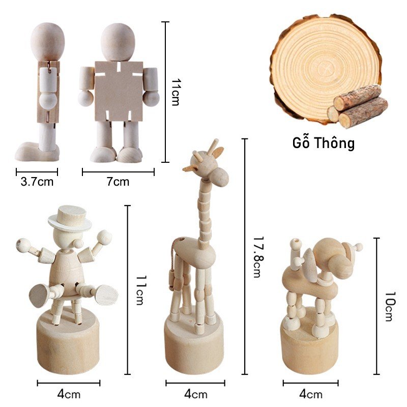 + Mẫu Hươu cao cổ: 4 x 17.8cm. + Mẫu Chú Hề gỗ: 4 x 11cm. + Mẫu Người gỗ: 3.7 x 7 x 11cm. + Mẫu Con Chó: 4 x 10cm.
