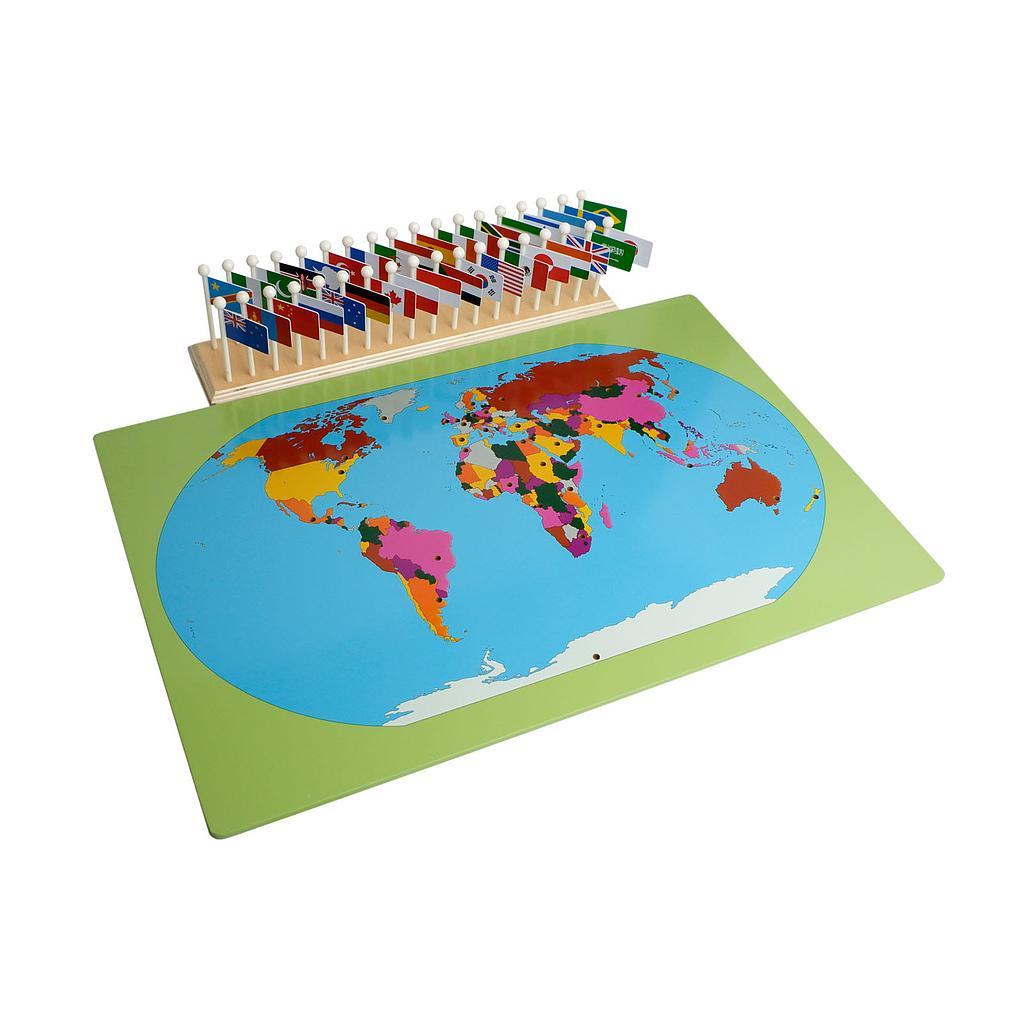 Gồm 36 lá cờ của các nước trải rộng trên khắp các lục địa trên thế giới và một bản đồ thế giới được chia bên giới và màu theo nước. Ứng với mỗi lá cờ, có vị trí tương ứng ở trên bản đồ để trẻ thực hiệ...