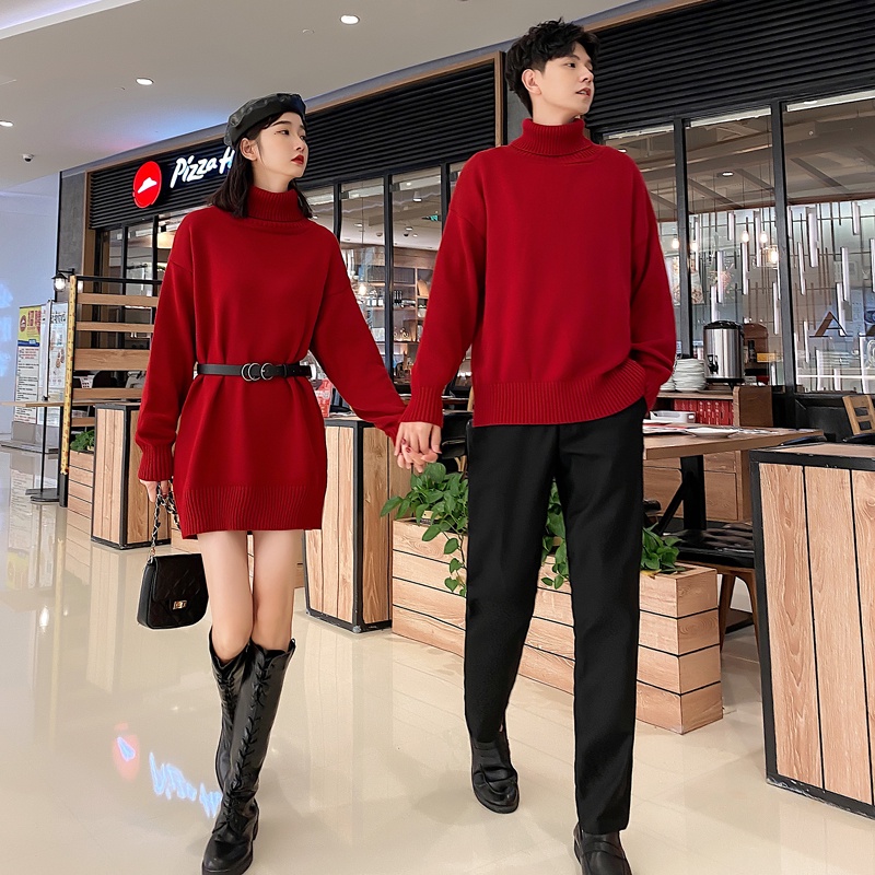Đồ couple đỏ cặp đôi nam nữ tết noel giáng sinh áo tay dài cổ lọ cao thu đông+đầm thắt nịch eo thon ulzzang có big siz
