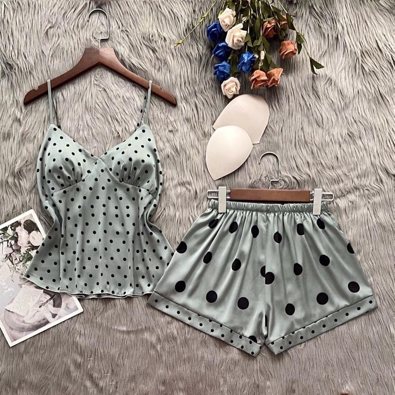 Đồ ngủ lụa latin 2 dây chấm bi freesize 40-57kg có kèm mút ngực