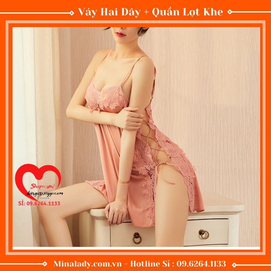 Đồ Ngủ Sexy Gồm Váy Ngủ Sexy Nữ Gợi Cảm Lụa 2 Dây Sexy Dễ Thương Và Quần Lót Lọt Khe Nữ Sẽy Không Kèm Mút Ngực -Đan Dây