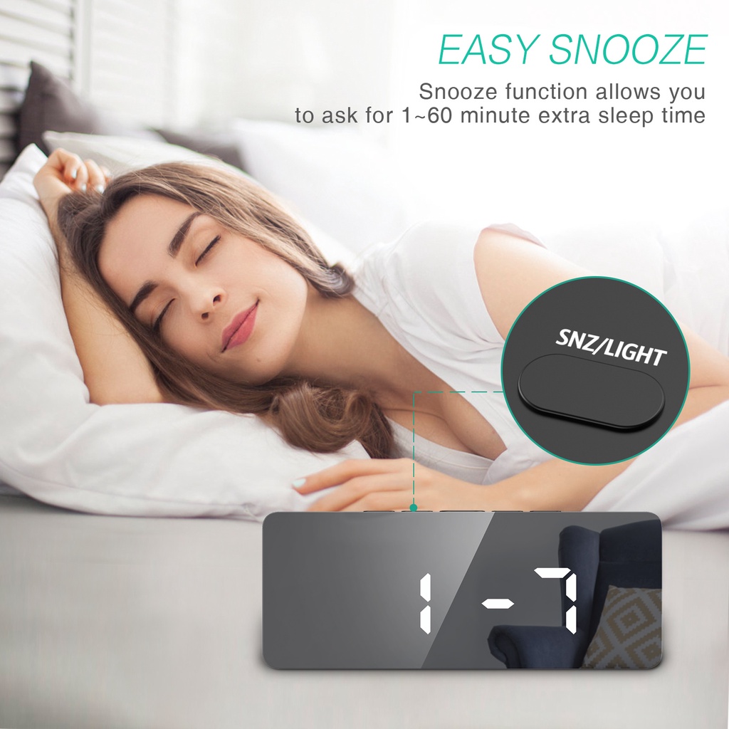 Mô tả sản phẩm ⏰【Đồng Hồ báo thức gương LED】 Đồng hồ báo thức kỹ thuật số sử dụng màn hình gương LED siêu rõ nét 5,8 inch, có thể điều chỉnh đến 2 mức độ sáng. Nó không chỉ có thể kiểm tra thời gian (12 / 24H), ngày và nhiệt độ (℃/℉), Nhưng cũng như một chiếc gương t