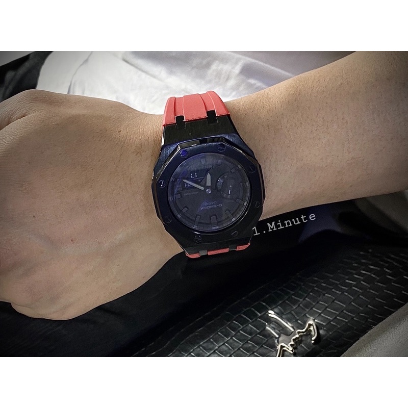 Đồng hồ nam GA-2100 custom vỏ thép đen dây cao su đỏ