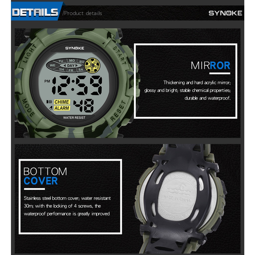 Đồng hồ nam SYNOKE đa chức năng Đèn LED phát sáng kỹ thuật số không thấm nước Ngụy trang Đồng hồ thể thao không thấm nước ngoài trời