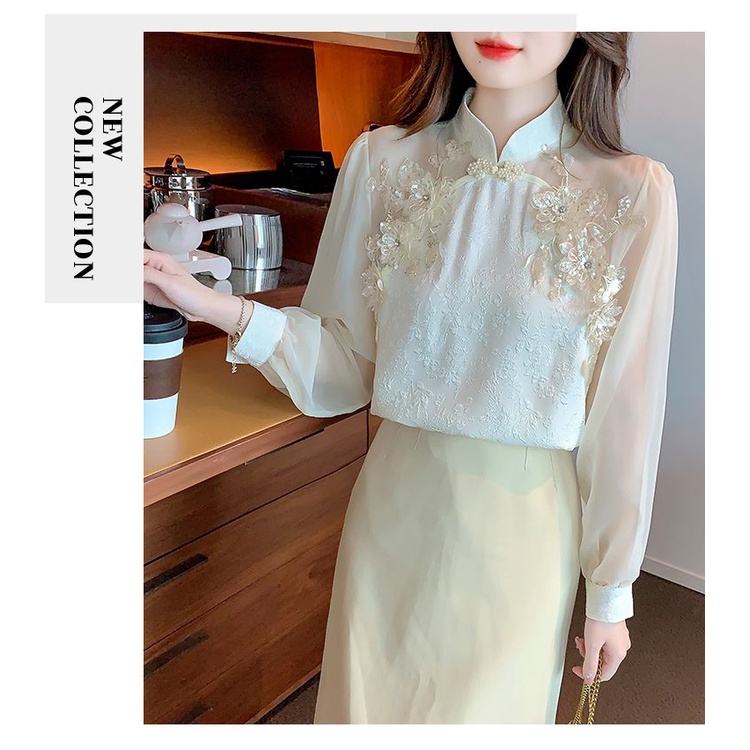 Đứng Áo Sơ Mi Tay Dài Màu Trơn Phong Cách Dân Tộc Cổ Điển Thời Trang Mùa Thu Cho Nữ