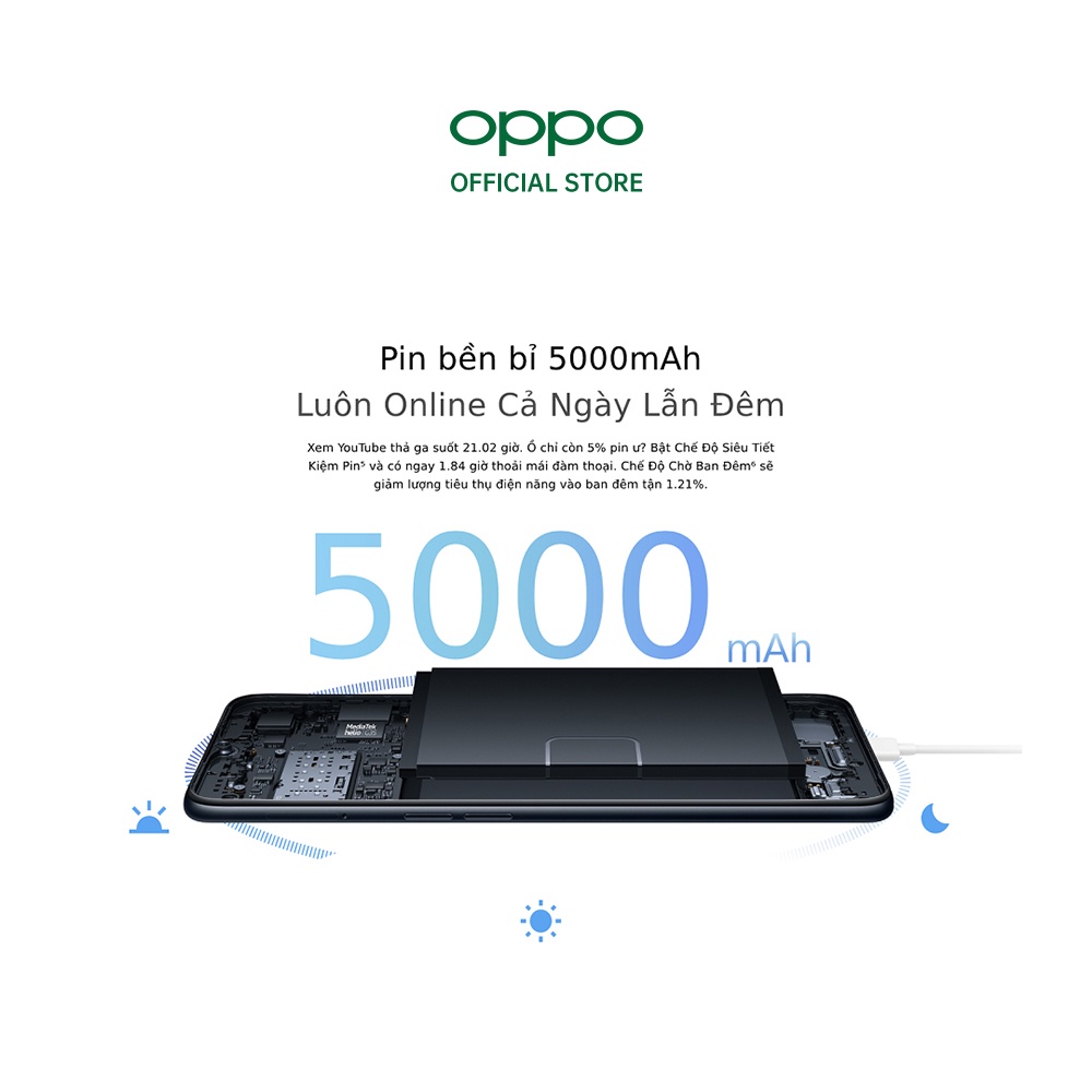 Thông số kỹ thuật tham khảo Màn Hình: Waterdrop screen 6.52'' 1600 x 720 HD+, IPS LCD Kích thước: 163.8 x 75.6 x 8.4 mm 190g CPU: MTK MT6765 (P35), Octa-core 2.3GHz GPU: IMG GE8320 RAM+ROM: 3GB + 32GB up to 256GB System: ColorOS 11.1 - Android 11 Camera Rear/Front: 13 + 2 + 2 / 8 Sim: 2 Nano SIM or 1 SIM + 1 MicroSD Battery - Charging: 5000 mAh Bộ sản phẩm bao gồm: Thân máy, sách hướng dẫn, cáp sạc, củ sạc Thông tin bảo hành: Sản phẩm được bảo hành 12 tháng tại các trung tâm bảo hành OPPO - 1 đổi 1 trong 30 ngày đầu sử dụng (Lỗi phần cứng sản xuất) - Giao hàng trên toàn quốc - Hotline: 1800 577 776 (miễn phí)
