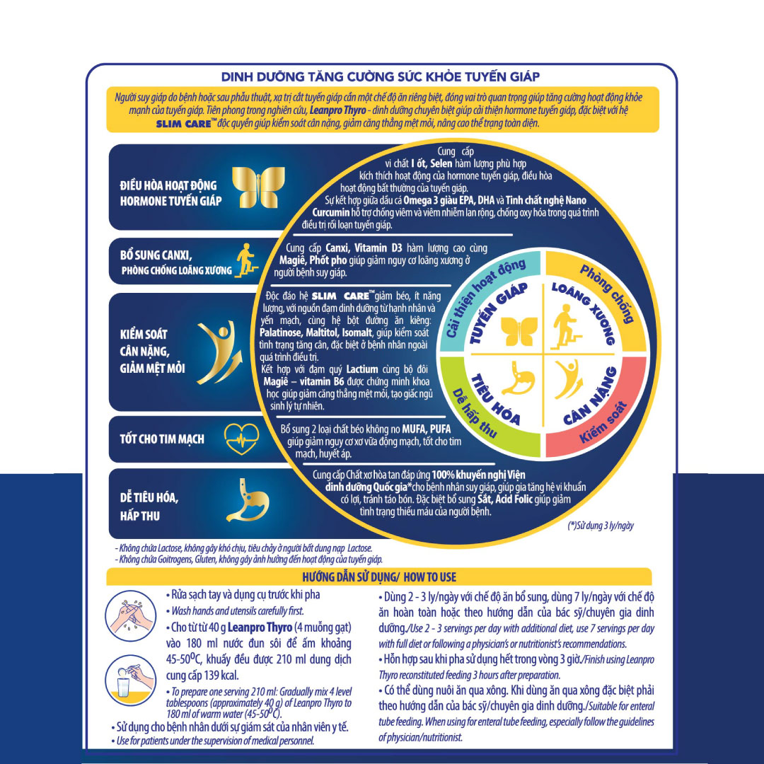 Leanpro Thyro dinh dưỡng chuyên biệt giàu I-ốt, Selen giúp cải thiện hormone tuyến giáp, đặc biệt với hệ SLIM CARE độc quyền giúp kiểm soát cân nặng, giảm căng thẳng mệt mỏi, nâng cao thể trạng toàn diện. Đối tượng: Dinh dưỡng chuyên biệt cho người sau phẫu thuật tuyến giáp hoặc người bệnh suy giáp. Công dụng: Cung cấp vi chất I-ốt, Selen hàm lượng phù hợp kích thích hoạt động của hormone tuyến giáp, điều hòa hoạt động bất thường của tuyến giáp. Cung cấp Canxi, Vitamin D3 hàm lượng cao giúp giảm nguy cơ loãng xương. Với tinh chất nghệ Nano Curcumin và Omega 3 giàu EPA, DHA hỗ trợ chống viêm nhiễm lan rộng, chống oxy hóa trong quá trình điều trị rối loạn tuyến giáp. Hệ SLIM CARE giảm béo ít năng lượng với nguồn đạm từ hạnh nhân và yến mạch cùng hệ bột đường ăn kiêng giúp kiểm soát tình trạng tăng cân. Bổ sung đạm quý Lactium cùng bộ đôi Mg - B6 được chứng minh khoa học giúp giảm mệt mỏi, cải thiện giấc ngủ. Chất xơ hòa tan (FOS/Inulin) tốt cho tiêu hóa, giảm tình trạng táo bón. (*) Sử dụng 3 ly/ngày. Quy cách đóng gói: 400g: 24 lon/thùng 900g: 12 lon/thùng Hướng dẫn sử dụng: - Sử dụng 2-3 ly/ngày với chế độ ăn bổ sung, dùng 7 ly/ngày với chế độ ăn hoàn toàn hoặc theo hướng dẫn của bác sỹ/chuyên gia dinh dưỡng. - Sử dụng cho người bệnh dưới sự giám sát của nhân viên y tế. - Có thể dùng nuôi ăn qua xông. Khi dùng qua xông đặc biệt phải theo hướng dẫn của bác sỹ/chuyên gia dinh dưỡng. Giá sản phẩm trên Tiki đã bao gồm thuế theo luật hiện hành. Bên cạnh đó, tuỳ vào loại sản phẩm, hình thức và địa chỉ giao hàng mà có thể phát sinh thêm chi phí khác như phí vận chuyển, phụ phí hàng cồng kềnh, thuế nhập khẩu (đối với đơn hàng giao từ nước ngoài có giá trị trên 1 triệu đồng).....