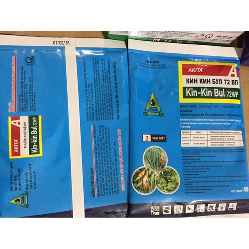 CHI TIẾT SẢN PHẨM Chế Phẩm Trừ Nấm Bệnh Cây Kin Kin Bul 72WP-Đặc Trị Thối Nhũn gói 45g - KIN KIN BUL 72WP gói 40g là chế phẩm trừ bệnh hỗn hợp giữa 2 hoạt chất Macozeb và Cymoxanil có tác động tiếp xúc nội hấp và lưu dẫn mạnh. - Xuất xứ: Bungaria - Giải pháp vàng phòng và trị bệnh thối nhũn cho lan trong mùa mưa cực kì hiệu quả. - Có thể pha chung với các thuố.c trừ bệnh rỉ sắt, thối cuống, rụng trái ( thán thư) trên cà phê, điều. Vàng lá, loét mặt trên cao su và các bệnh sương mai. Thán thư, đốm nâu trên 1 số cây trồng. Cách dùng: - Pha 50g cho 20 Lít nước phun ướt đều trên cây trồng - Nếu bệnh nặng phun nhắc lại lần 2 sau 5-7 ngày. - Có thể pha chung với các loại phân bón, chế phẩm không có tính kiềm. - Phòng bệnh : tháng 2 lần