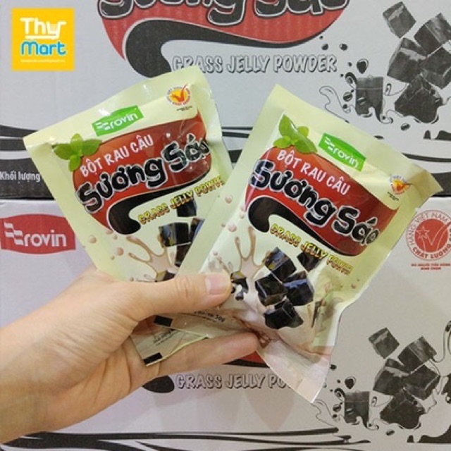 1 gói Sương Sáo Đen Rovin 50g làm thạch đen topping kèm với sữa hoặc trà sữa thái