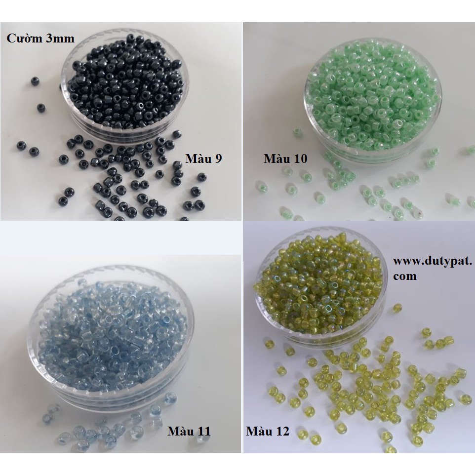 Hạt cườm size trung đường kính khoảng 3mm, đường kính lỗ xỏ 1,2-1.4mm dùng trang trí trang sức vòng tay, vòng cổ, dây đeo khẩu tang, đính trang trí quần áo, túi xách, giày dep... các hạt có đường kính bằng nhau nhưng không đều nhau về chiều dài. Gói 10gam cỡ trên 1000 hạt Màu Sắc: shop có trên 60 màu. T01-hồng tươi nhân T02-Hồng phấn T03-hồng da T04-hồng cam nhân T05- đỏ cam T06-đỏ tươi T07-hồng đậm nhân T08 cam hồng(có ánh cừ) T09- xanh lá(có ánh cừ) T10-xanh mạ(có ánh cừ) T11 xanh biển(có ánh cừ) T12 xanh ngọc T13 vàng trà T14 vàng tươi T15 xanh cốm T16 xanh lá đậm T17 xanh mint T18 trắng trong T19 trắng mờ T20 trắng sữa T21 đen bóng T22 Nâu T23 xanh coban T24 xanh lý T25 đỏ đục T26 kem nhân T27 xám đồng T28 đỏ hồng T29 cam đục T30 hồng tím T31 vàng nhân bạc T33- xám trong T34xanh tím T35-tím nhân T36 vàng chanh(có ánh cừ) T37 vàng đậm T38-tím hồng nhân T39-hồng tím nhân T32 xám đen T40 vàng ánh cừ T41- xanh lá trong T42 đồng nhân bạc T43 xám bạc T44 tím Huế T45 tím nhạt T46 tím nho T47 đỏ đô T48 xanh bích T49 vàng đậm ánh cừ T50 kem đậm nhân Quý khách có thể tham khảo thêm hàn ngàn sản phẩm khác trên web https://shopee.vn/dutypatshop Cần mua sĩ hay tư vấn gấp vui lòng liên hệ dt/zalo: 0972890503