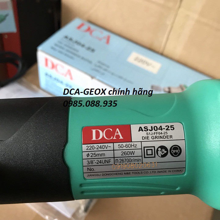 Máy mài khuôn DCA ASJ04-25 - máy mài khuôn DCA đầu 10mm Thông số kỹ thuật - Mã sản phẩm: ASJ04-25 - Nhà sản xuất: DCA - Công xuất: 260W - Điện áp: 220V-50Hz - Tốc độ: 26700 vòng/phút - Cốt mũi mài: 6mm - Khả năng mài từ 6-25mm - Trọng lượng: 1.3kg - Bảo hành: 6 tháng