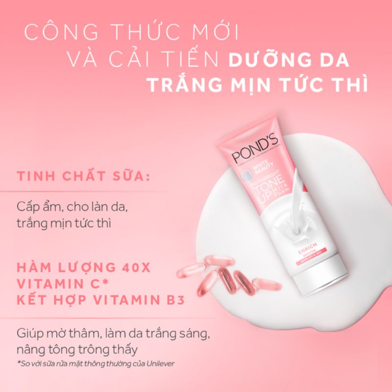 Sữa rửa mặt sáng da Pond's White Beauty 15g có chứa công thức độc đáo với Glycerin và Pro-Vitamin B3 làm giảm tình trạng xỉn màu và làm sáng da, đồng thời giảm thiểu các tế bào chết và kém tươi sáng. Bên cạnh đó, sản phẩm còn bổ sung độ ẩm cùng dưỡng chất dưỡng trắng tự nhiên cho da dần trở nên trắng hồng rạng rỡ. Đây là dòng sữa rửa mặt căn bản dùng hàng ngày với các công dụng như làm sạch da, tạo bọt mịn, giá thành phải chăng. Sản phẩm tạo bọt khá tốt nên rất tiết kiệm cho người sử dụng. Hãy cảm nhận làn da sạch, mềm mịn và ửng hồng rạng rỡ mà bạn yêu thích. Sữa rửa mặt sáng da Pond's White Beauty với tác động micro-foam, công thức bọt mềm dịu nhẹ giúp nhẹ nhàng tẩy tế bào chết và bụi bẩn, bã nhờn trên da, giúp mang lại vẻ sáng mịn, rang rỡ tự nhiên cho làn da mỗi ngày! Công thức chứa Vitamin B3+ giúp làm sáng da và mờ vết thâm. Chiết xuất nụ tầm xuân giúp trung hòa các gốc tự do, cấp ẩm cho da, mang lại vẻ mềm mịn cho làn da. Thành phần và công dụng - Lycopene là chất chống oxy hoá mạnh mẽ thường thấy trong rau và hoa quả màu đỏ đem lại cho bạn vẻ đẹp trắng hồng. - Cho làn da mịn màng và trắng hồng rạng rỡ - Làm sạch sâu từ trong lỗ chân lông - Giảm thiểu lớp da xỉn màu và làm sáng da - Giảm thiểu tế bào già và kém tươi sáng Loại da phù hợp: Sản phẩm dùng được cho mọi loại da. Hướng dẫn sử dụng: - Làm ướt mặt, lấy một lượng nhỏ sản phẩm vào tay, cho nước vào, tạo bọt và massage mặt một cách nhẹ nhàng, tránh vùng mắt, sau đó rửa sạch bằng nước. - Dùng ít nhất 2 lần vào buổi sáng và buổi tối trong ngày để đạt hiệu quả tối ưu.