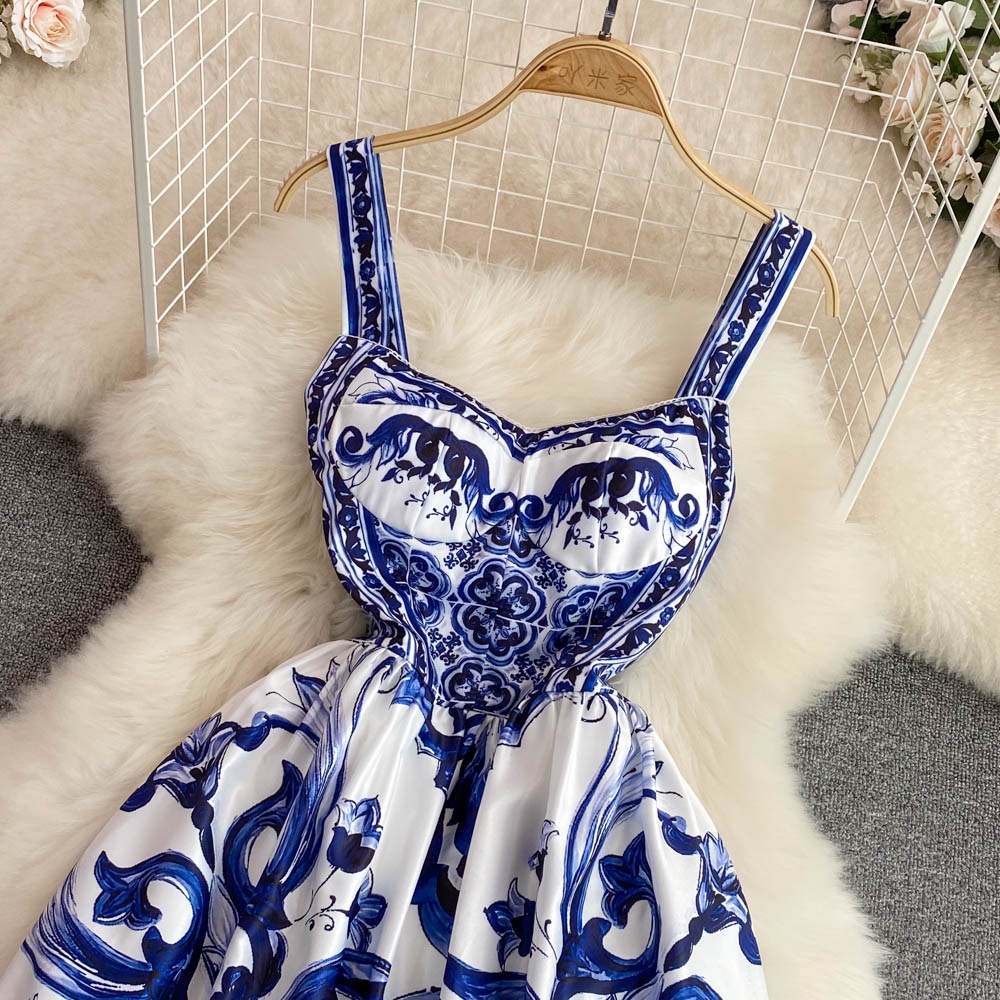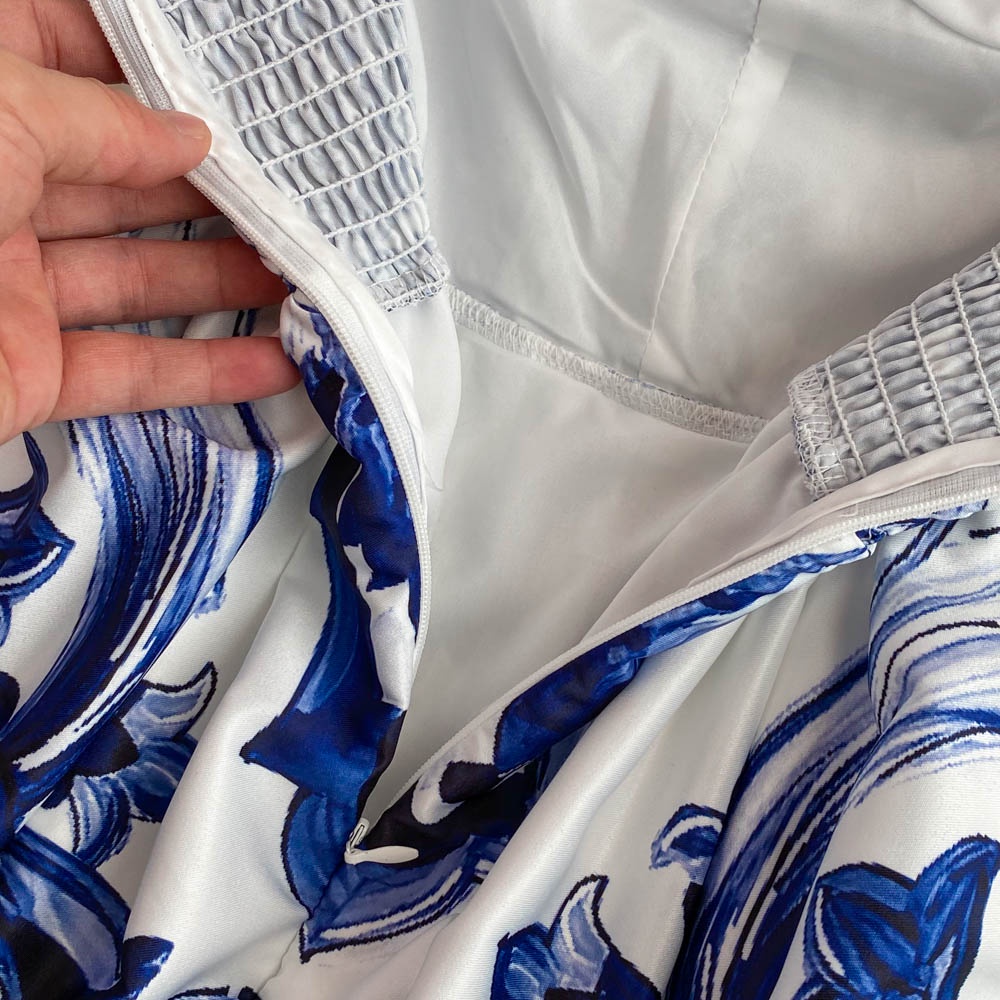 #2187 Đầm hai dây nền trắng họa tiết xanh dương có đệm ngực dáng dài váy cao cấp