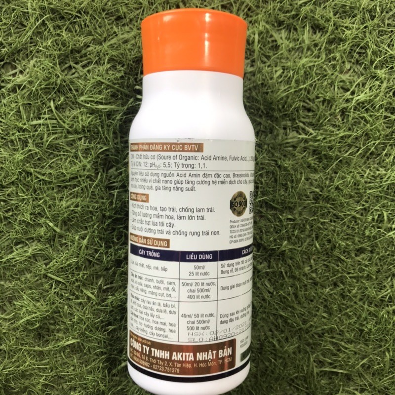 Nitrogen (N), Total L-form Amino Acids (AA), Glycine AA, Glutamic AA, Aspartic AA, Lysine AA, Arginine AA, Threonine AA, Valine AA, Phenylalanine AA, Lsoleucine AA, Histidine AA, Methionine AA, Tyrosine AA, Cystine AA, Taurine, Carnosine AA Công dụng: Kích thích cây con phát triển nhanh, rễ khỏe, hạn chế các loại bệnh và thiếu vi lượng, ngừa được nấm bệnh ở rễ. Tăng khả năng quang hợp cho cây, tăng sức đề kháng, biến cây còi cọc thành cây khỏe mạnh. Kích thích cây ra bông đều, ra bông tập trung, bông lớn. Chống vàng nụ non, rụng bông lúc đang ra hoa, hạn chế rụng trái non, tăng đậu quả, trái lớn nhanh, bóng đẹp, làm tăng độ ngọt của trái, trái to, quả mọng. Tăng khả năng chống chịu chua phèn đối với lúa, ngộ độc hữu cơ, giảm lem lép hạt, lúa chắc, sáng và dày hạt. Đặc hiệu cho các loại rau, hoa, cây cảnh và đặc biệt là phong lan và cây trồng trên giá thể. Thúc đẩy cây con phát triển nhanh, kích ra bông sớm, cây nhiều bông, bông lớn, màu đẹp, lâu héo, lâu rụng. Hướng dẫn sử dụng: Phun: Pha 500ml/ 360-400 lít nước cho mỗi lần, tương đương 20-25ml/ bình phun 16-25 lít (tùy vào đối tượng cây trồng và dụng cụ phun). Tưới: 1-2ml/ lít nước tưới theo chu vi tán cây, tùy theo cây lớn nhỏ mà điều chỉnh lượng nước cho phù hợp. Dùng cho thủy canh: 1-2ml/ lít dung dịch thủy canh. Không được phun chung với các sản phẩm chứa đồng (Cu), dầu và lưu huỳnh (S) hoặc phun giữa 2 lần phun mà 2 lần đó có phun các sản phẩm chứa đồng (Cu). Hướng dẫn bảo quản: Bảo quản nơi khô ráo, thoáng mát. Tránh ánh nắng trực tiếp. Tránh xa tầm tay trẻ em.